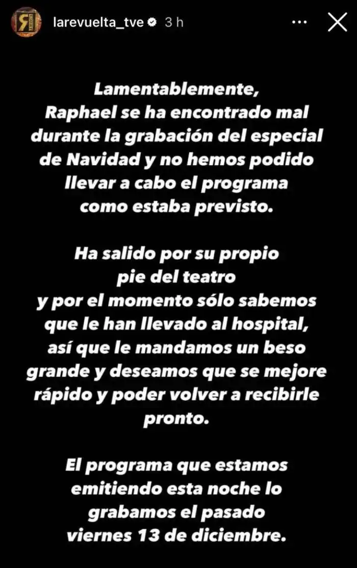 El diario español El País fue uno de los primeros medios en dar a conocer que Raphael fue ingresado de emergencia a un hospital madrileño, luego de que sufriera un accidente cerebrovascular, que se da cuando disminuye el flujo sanguíneo en el cerebro.