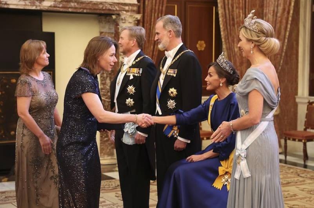 Puesto que los saludos a los invitados al banquete iba a durar unos 45 minutos, doña Letizia, con vestido de noche y tiara, optó por adoptar una postura más descansada y se sentó en una silla, mientras que Felipe VI y los reyes neerlandeses, Guillermo Alejandro y Máxima, lo hicieron de pie.