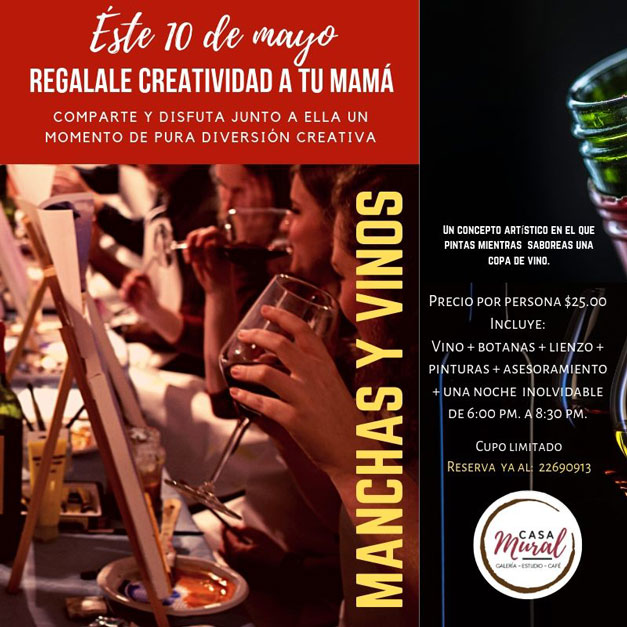 Este 10 de mayo, Casa Mural tiene una opción única y creativa para que le regales a mamá en este día especial. El evento esta denominado “Manchas y Vinos” y este cuenta con un concepto artístico en donde mientras pintas también saboreas de una copa de vino.