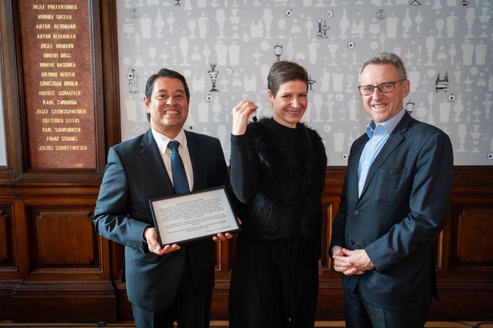 El Dr. Juan Fernando Villafuerte (izq.), la Dra. Barbara Staudinger, presidenta del Museo Judío de la Ciudad de Viena, y Ernst Woller, presidente del Parlamento de la Ciudad Estado Federado de Viena.