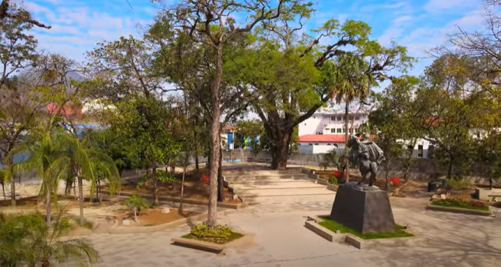 A través de imágenes de drone, el canal de YouTube deja ver que la figura a caballo ahora ocupa el espacio de un kiosco rústico que ya fue retirado por completo de esta plaza que data posiblemente de la fundación de la villa de San Salvador, en el año 1525.