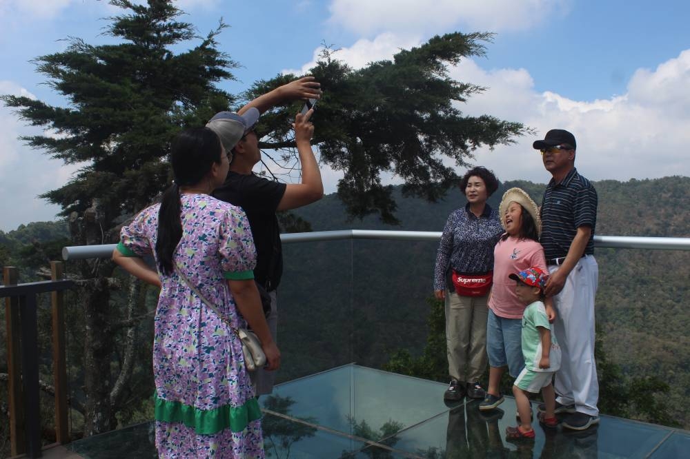 Un grupo de turistas extranjeros aprovecha la vista del mirador de cristal en el parque nacional El Boquerón para tomarse una fotografía. / Foto: Karla Martínez.