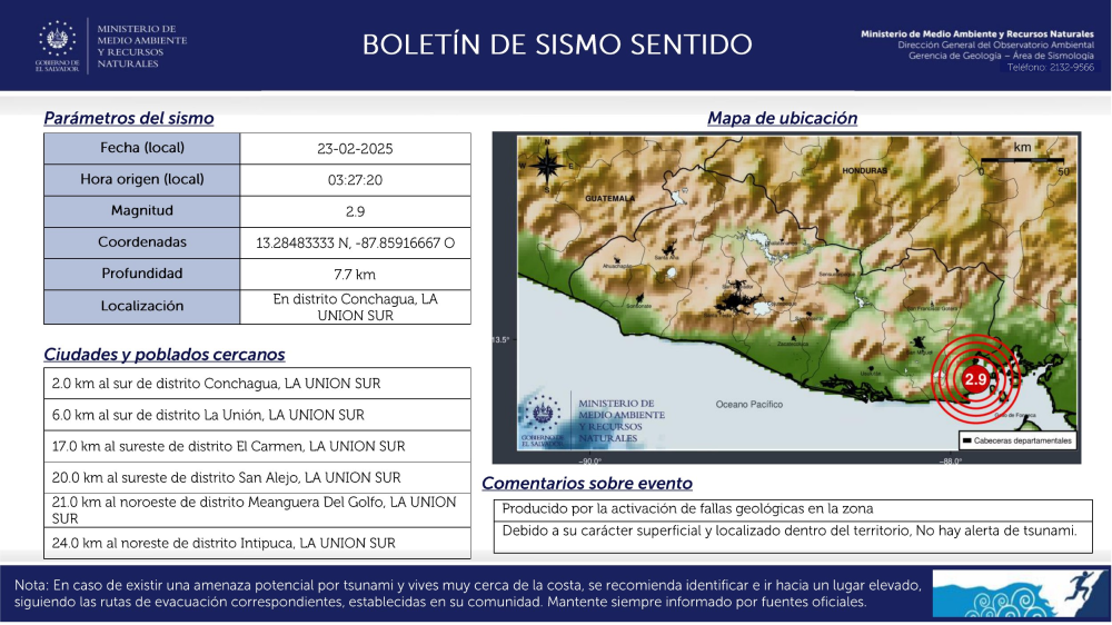 El sismo de mayor magnitud se registró a las 5:32 de la tarde del día 8 de febrero, con una magnitud de 4 en la escala de Richter, a una profundidad de 10 kilómetros, y una intensidad de IV la escala Mercalli Modificada en Conchagua y alrededores.