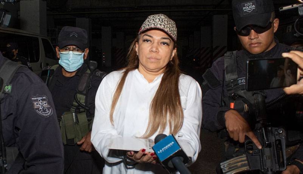 Con vestido blanco, gorra y de plataformas, salió Nercy Montano de la intimación de los delitos y al ser interrogada por la prensa en las afueras del Centro Integrado de Justicia de Soyapango, guardó silencio.Caso.
