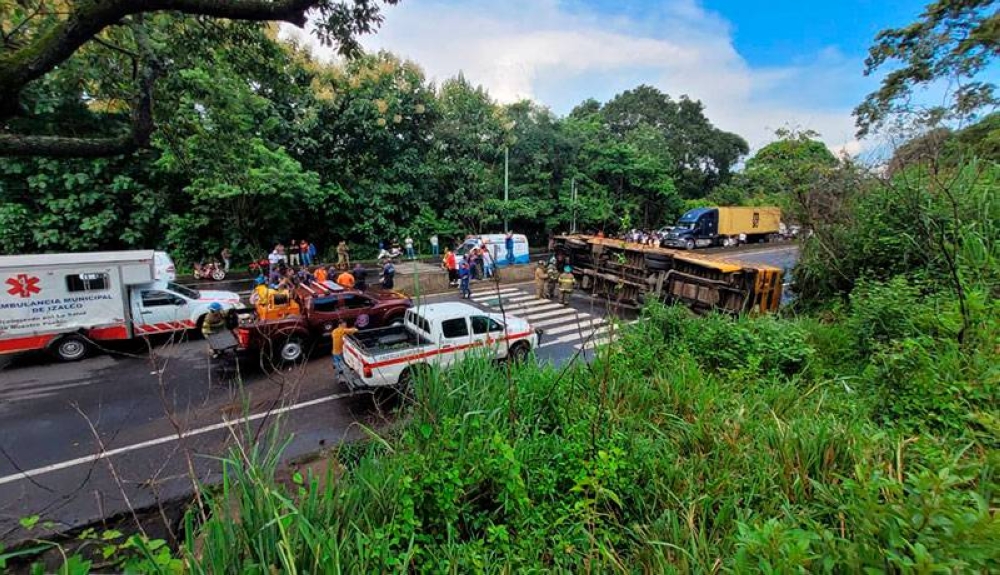 Tres personas resultaron lesionados luego de que un autobús volcara en la carretera que de Sonsonate conduce a San Salvador.