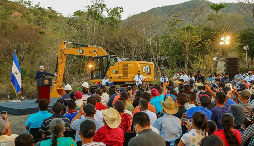 Bukele le dijo a un grupo de habitantes y vecinos de los municipios beneficiados que los trabajos de construcción inician hoy y que son parte de las obras de compensación social del proyecto de la Central Hidroeléctrica 3 de Febrero.