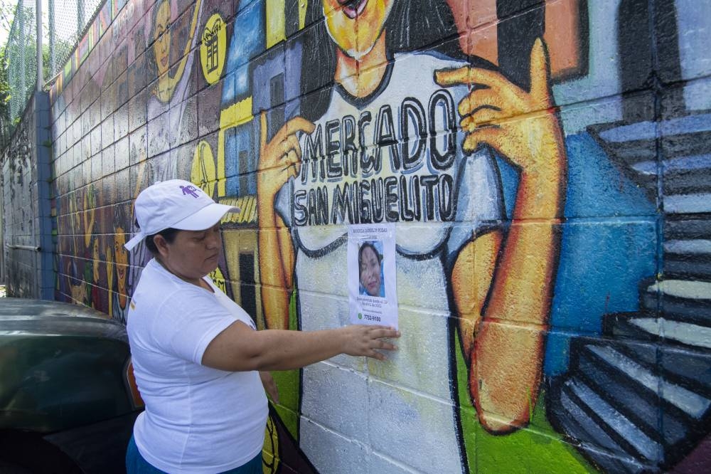 Beatriz Hernández, madre de Marcela Rodas, pega afiches con la fotografía de su hija cerca del Mercado San Miguelito, donde trabajaba. / Lisbeth Ayala.
