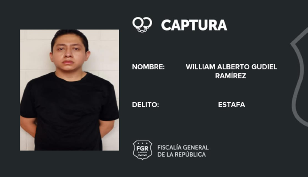 William Alberto Gudiel Ramírez fue capturado este jueves en Zaragoza, La Libertad, y es “acusado de estafar a una persona a través de redes sociales”, informó la Fiscalía General de la República (FGR) en su cuenta de Twitter.
