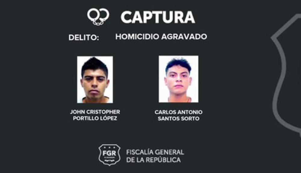 La Fiscalía General de la República (FGR) reportó la captura de Jhon Christopher Portillo y Carlos Antonio Santos, acusados de asesinar a una persona de la tercera edad que se dirigía a comprar pan, los hechos sucedieron el pasado 1 de octubre en el departamento de San Miguel.