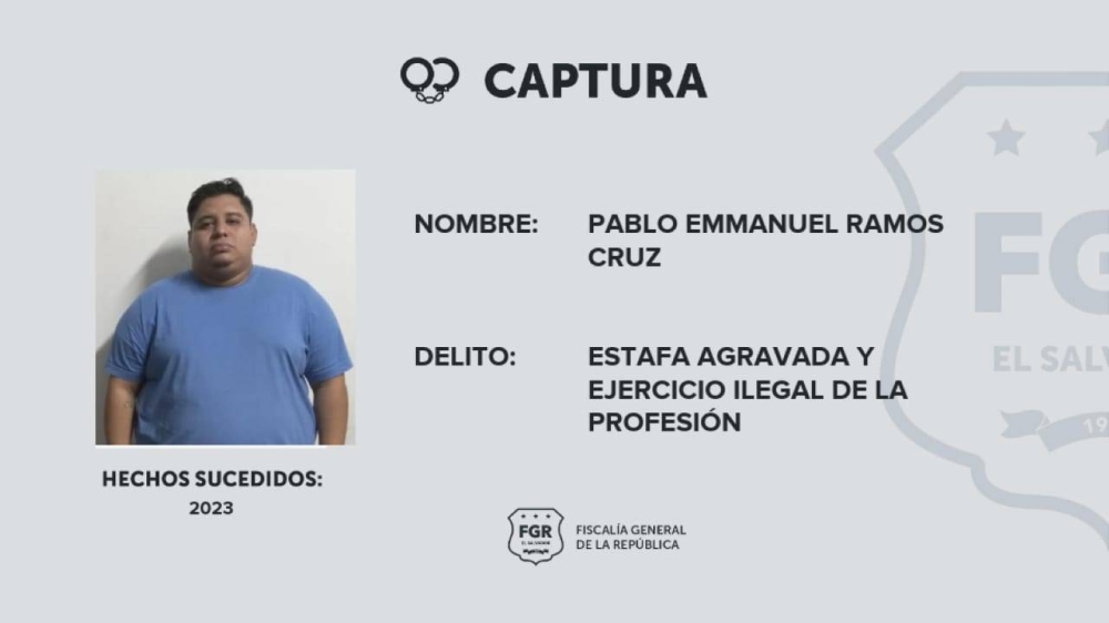 #Captura I Por orden de la @FGR_SV, Emmanuel Ramos Cruz fue detenido acusado de estafar a dos víctimas con $4,600 dólares y de hacerse pasar por abogado.