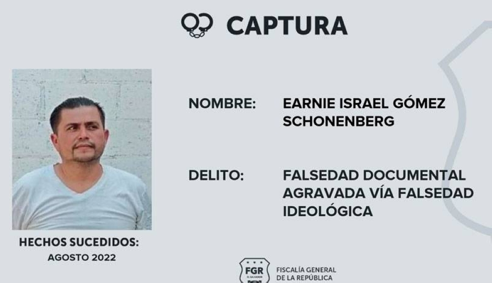 #Captura | Por orden de la @FGR_SV, Earnie Israel Gómez Schonenberg ha sido capturado por el delito de falsedad documental agravada vía falsedad ideológica.