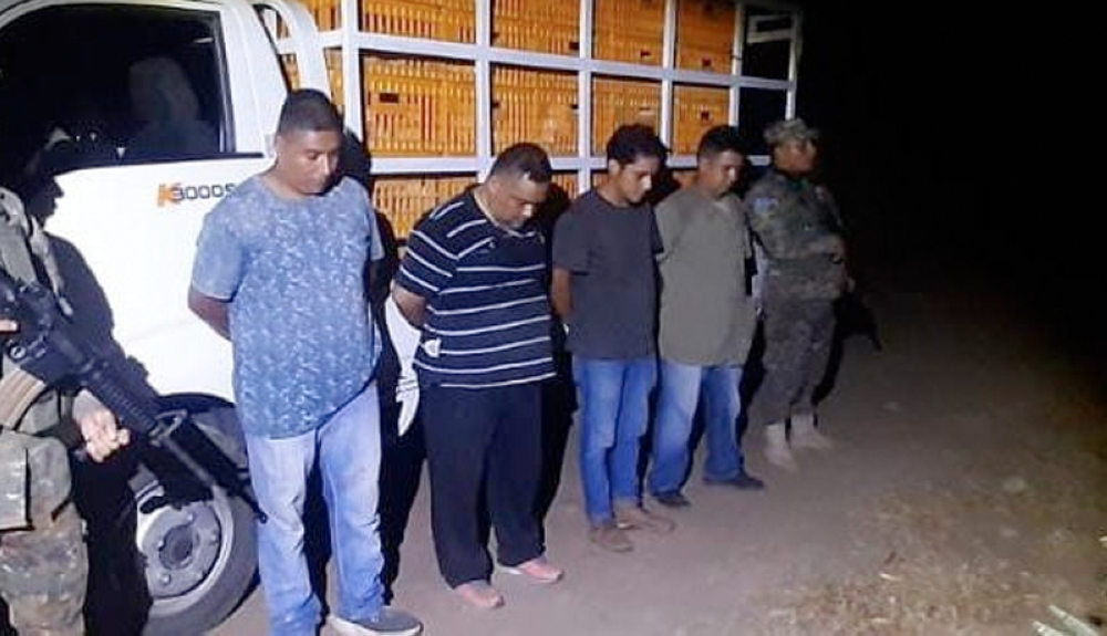 Cuatro hombres que según las autoridades integran una banda de contrabandista de gallinas, fueron capturados este sábado en un cruce fronterizo no autorizado entre Guatemala y El Salvador.