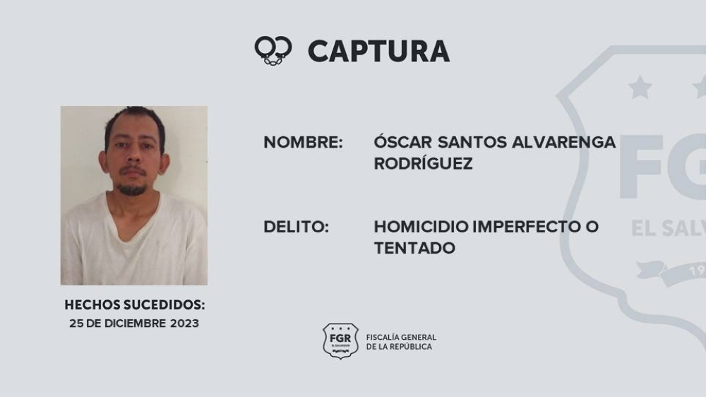 La Fiscalía General de la República (FGR) informó este viernes sobre la orden de captura de Òscar Santos Alvarenga Rodríguez, quien es señalado de intentar asesinar a una mujer en el municipio de Colón, La Libertad.