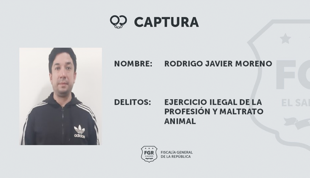 Agentes de la Fiscalía General de la República (FGR) y de la Policía Nacional Civil (PNC) capturaron, este viernes, a Rodrigo Javier Romero y lo acusan de los delitos de "ejercicio ilegal" de la práctica veterinaria, además de maltrato animal.