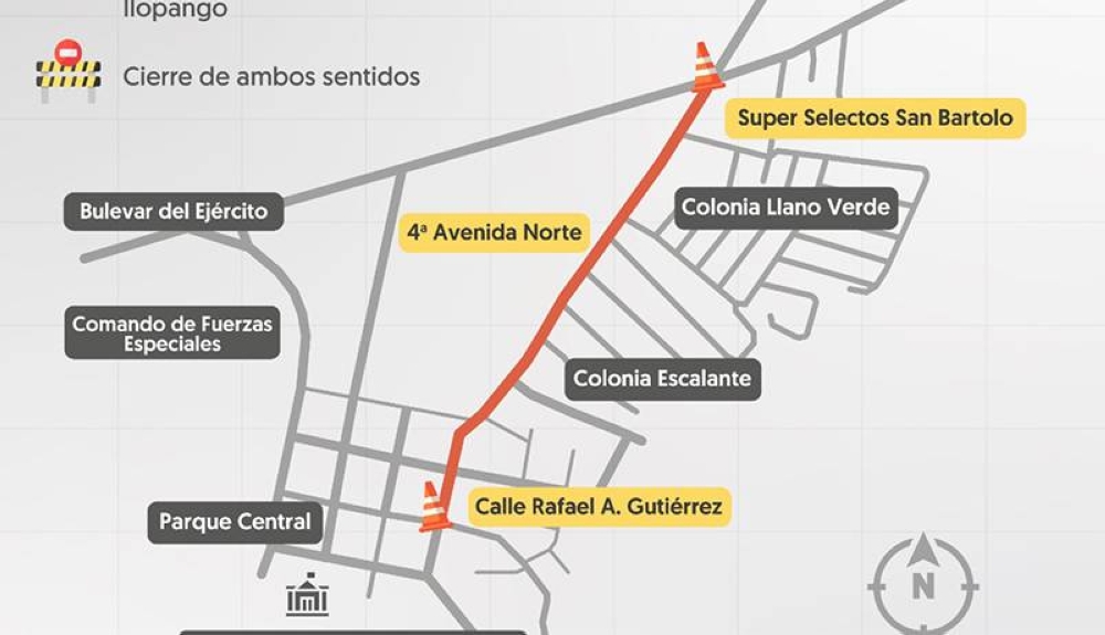 Informamos sobre el cierre de calle en ambos sentidos desde el Súper Selectos San Bartolo, en la 4ª Avenida Norte, hasta la intersección con la calle Rafael A. Gutiérrez, en Ilopango, San Salvador Este.