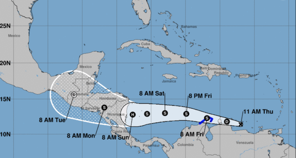 "Se pronostica que el sistema se moverá a través del suroeste del Mar Caribe y se acerque a la costa de Nicaragua el domingo", subrayó el CNH.