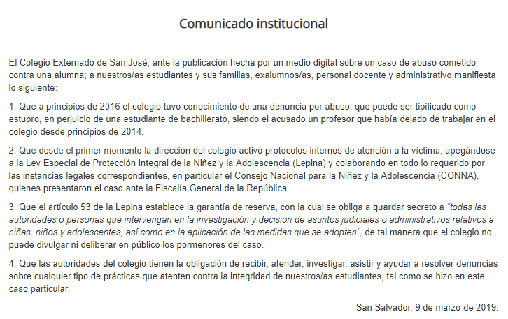 "Desde el primer momento la dirección del colegio activó protocolos internos de atención a la víctima, apegándose a la Ley Especial de Protección Integral de la Niñez y la Adolescencia (Lepina) y colaborando en todo lo requerido por las instancias legales correspondientes, en particular el Consejo Nacional para la Niñez y la Adolescencia (CONNA), quienes presentaron el caso ante la Fiscalía General de la República", indican en un comunicado.