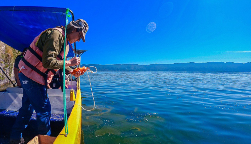 La proliferación de algas en el lago de Coatepeque, en Santa Ana, está en su proceso final. Este día, nuestro equipo técnico realizó monitoreo de parámetros físico químicos y tomó muestras para análisis en el sector donde el fin de semana se registró coloración turquesa. pic.twitter.com/TibSu72BcN