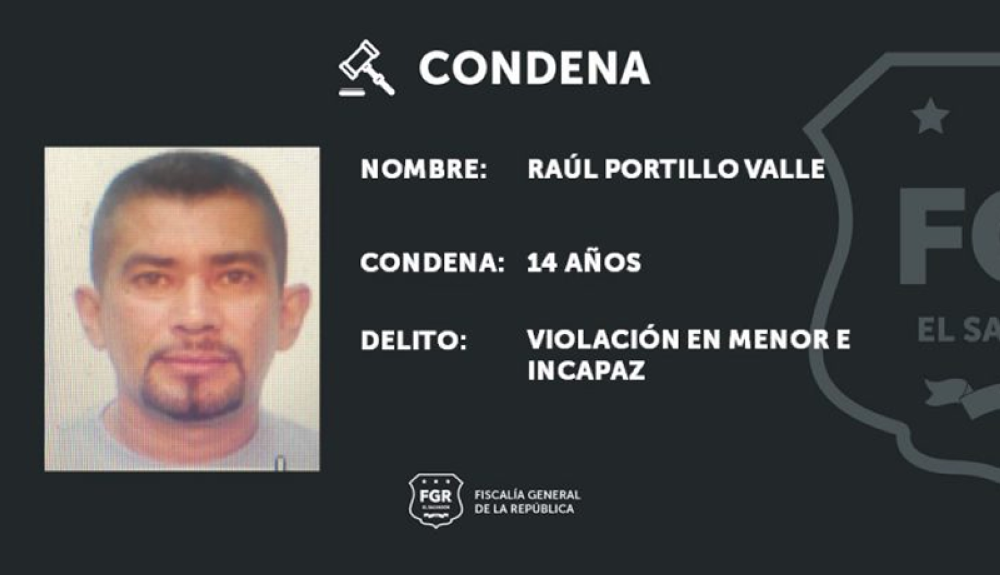 La Fiscalía General de la República (FGR) notificó, este lunes, que Raúl Antonio Portillo Valle fue condenado por el Tribunal Segundo de Sentencia de Santa Ana, a 14 años de cárcel por haber violado a una mujer con discapacidad mental.