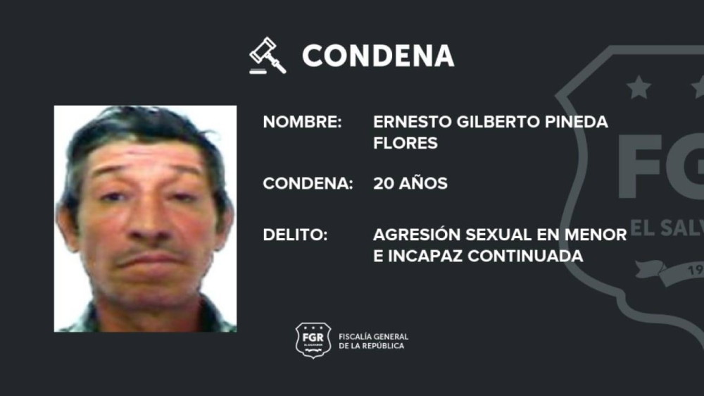 El Tribunal de Sentencia de Chalatenango condenó a 20 años de cárcel a Ernesto Gilberto Pineda Flores, quien violó en reiteradas ocasiones a una niña de 8 años de edad, en el municipio de Agua Caliente, departamento de Chalatenango.