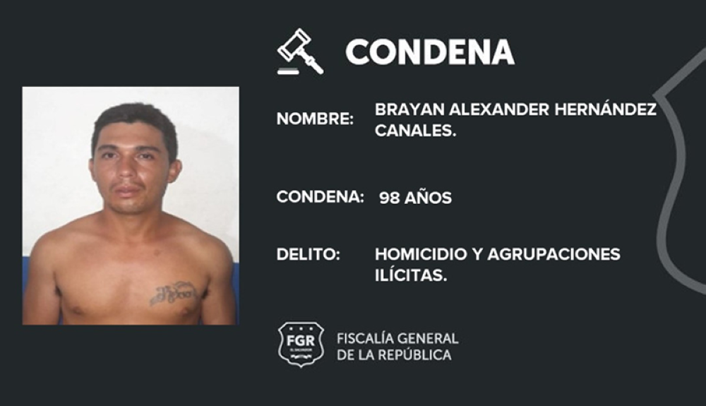 Brayan Alexander Hernández Canales, es un pandillero de la MS-13 que fue condenado a 98 años de cárcel “por haber participado en el asesinato de cinco personas cometidos entre abril de 2015 y octubre de 2016, en Morazán”, según reportes de la Fiscalía General de la República (FGR).