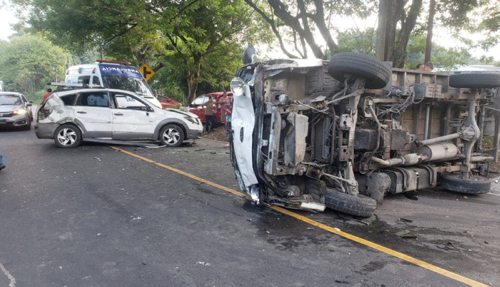 La múltiple colisión ocurrió cuando el conductor de un camión chocó con tres vehículos particulares y luego volcó. En el accidente resultaron cuatro personas lesionado que fueron atendidas en el lugar por equipo de Comandos de Salvamento, el Servicio de Emergencias Médicas y la Policía Nacional Civil.
