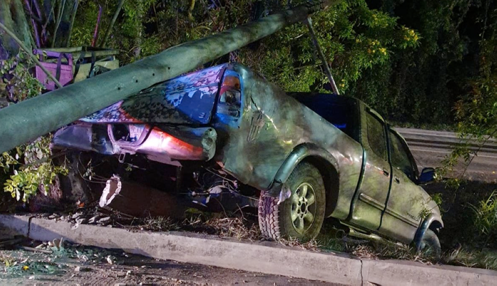 El conductor de un pick up perdió el control del vehículo, se salió de la vía en la autopista a Comalapa e impactó contra un poste del tendido eléctrico.