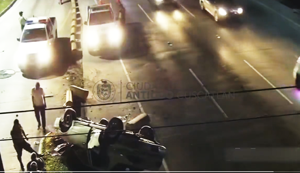 Las cámaras de video vigilancia de Antiguo Cuscatlán captaron el momento en el que ocurre un aparatoso accidente y vuelco de un vehículo, durante la madrugada de este jueves en la carretera Panamericana, cerca de una popular zona de centros comerciales.