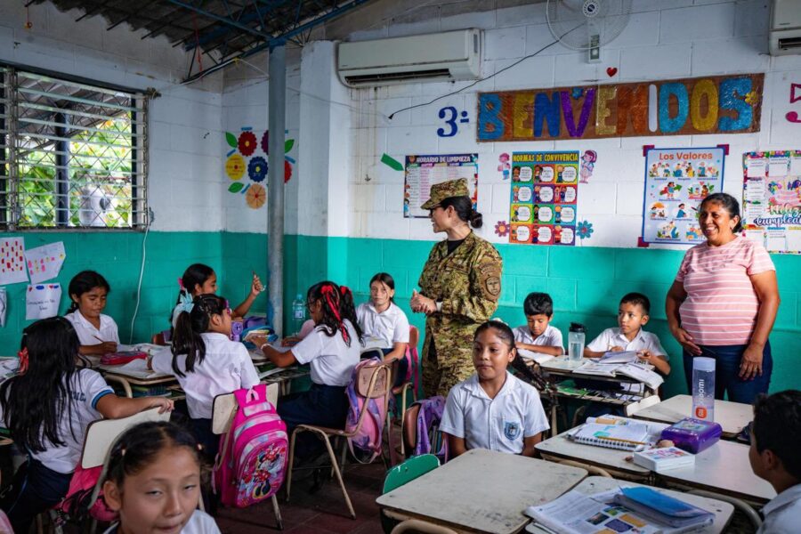 Desde el viernes, la nueva ministra ha realizado giras por escuelas públicas del área metropolitana, paracentral y el oriente del país, mientras vestía su uniforme militar.