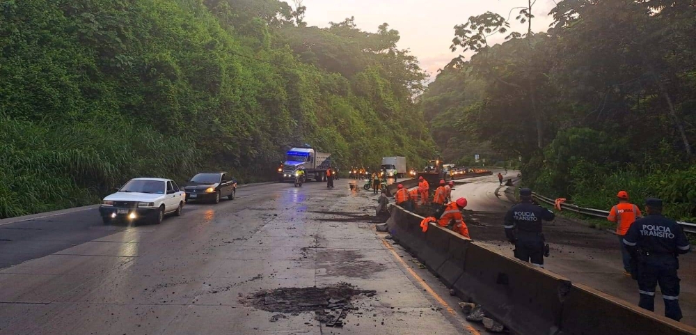 Cuadrillas de Fovial trabajaban en labores de limpieza para disminuir el impacto del aceite en la calzada y poder rehabilitar el tráfico en la zona.