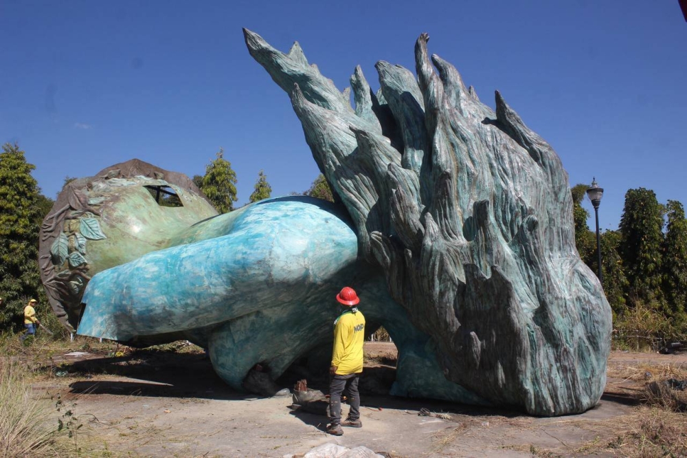 Rostro en el suelo luce la Mater Civis, la mujer azul del monumento a la Reconciliación. / Emerson Del Cid.
