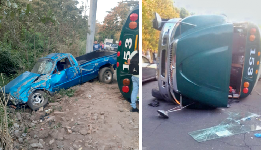 El accidente vial ocurrió km 47 ½ de esta vía que conecta a La Paz con San Salvador, y los primeros reportes de la Policía Nacional Civil (PNC) indican que "al bus se le estalló una llanta, chocó contra un pick up y terminó volcado".