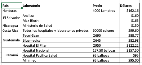Mientras que en Panamá, el hospital Nacional cobra 157.50 balboas, mismo valor equivalente a dólares. Ese valor es el más alto encontrado en ese país. El valor más bajo encontrado en Panamá están en el hospital Pacífica Salud y Minimed, cuyas pruebas cuestan $95.