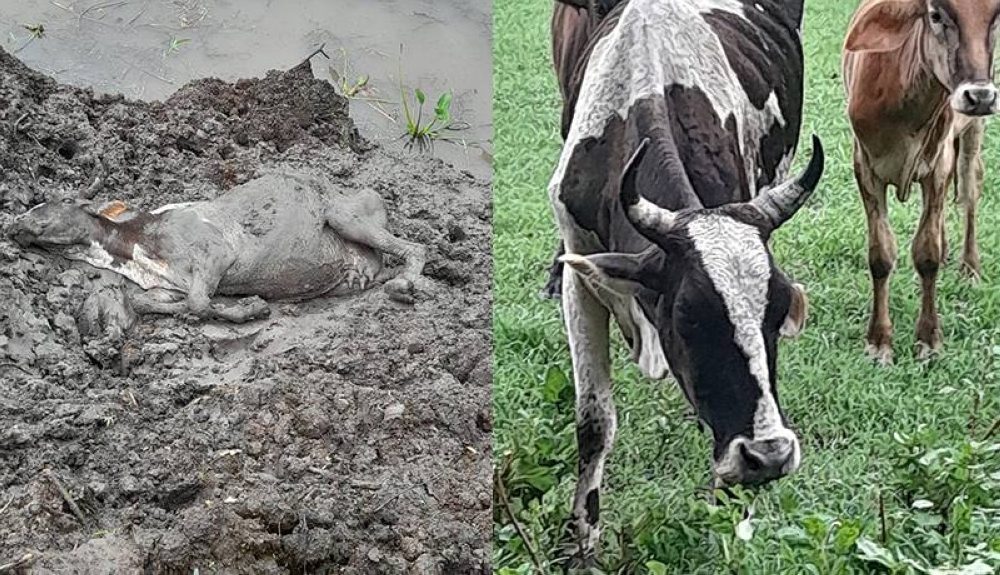 En redes sociales circuló este domingo una fotografía donde se miraba una vaca presuntamente muerta en el lodo, mientras que en otra imagen se visualizaba una caminando en medio de una inundación.