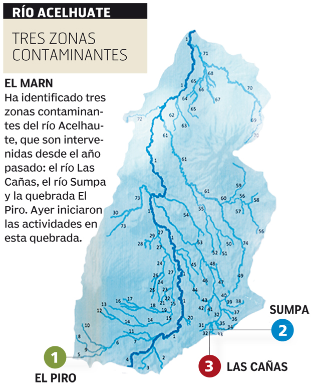 El MARN ha identificado tres zonas de mayor contaminación en el Acelhuate: el río Las Cañas y el Sumpa en Soyapango, así como la quebrada El Piro; recientemente en Las Cañas encontraron que cinco empresas están contaminando, pero ya iniciaron un proceso de construcción de plantas de tratamiento de aguas.