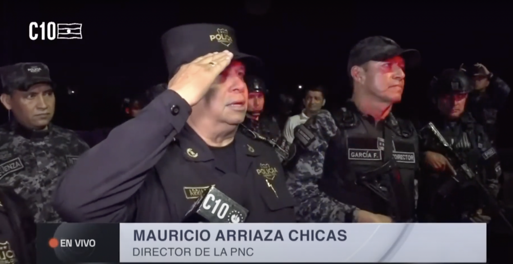 Seguido de esa narración, se observa que un agente policial y el director Arriaza Chicas ayudan a subir a la aeronave a Manuel Coto y después sube un tercer y cuarto uniformado a quienes no se les ve el rostro. Luego sube una persona con un pantalón beige y chumpa azul, a quien tampoco se le observa el rostro en la transmisión en directo. Esta señal se interrumpió a las 8:20 de la noche del domingo.