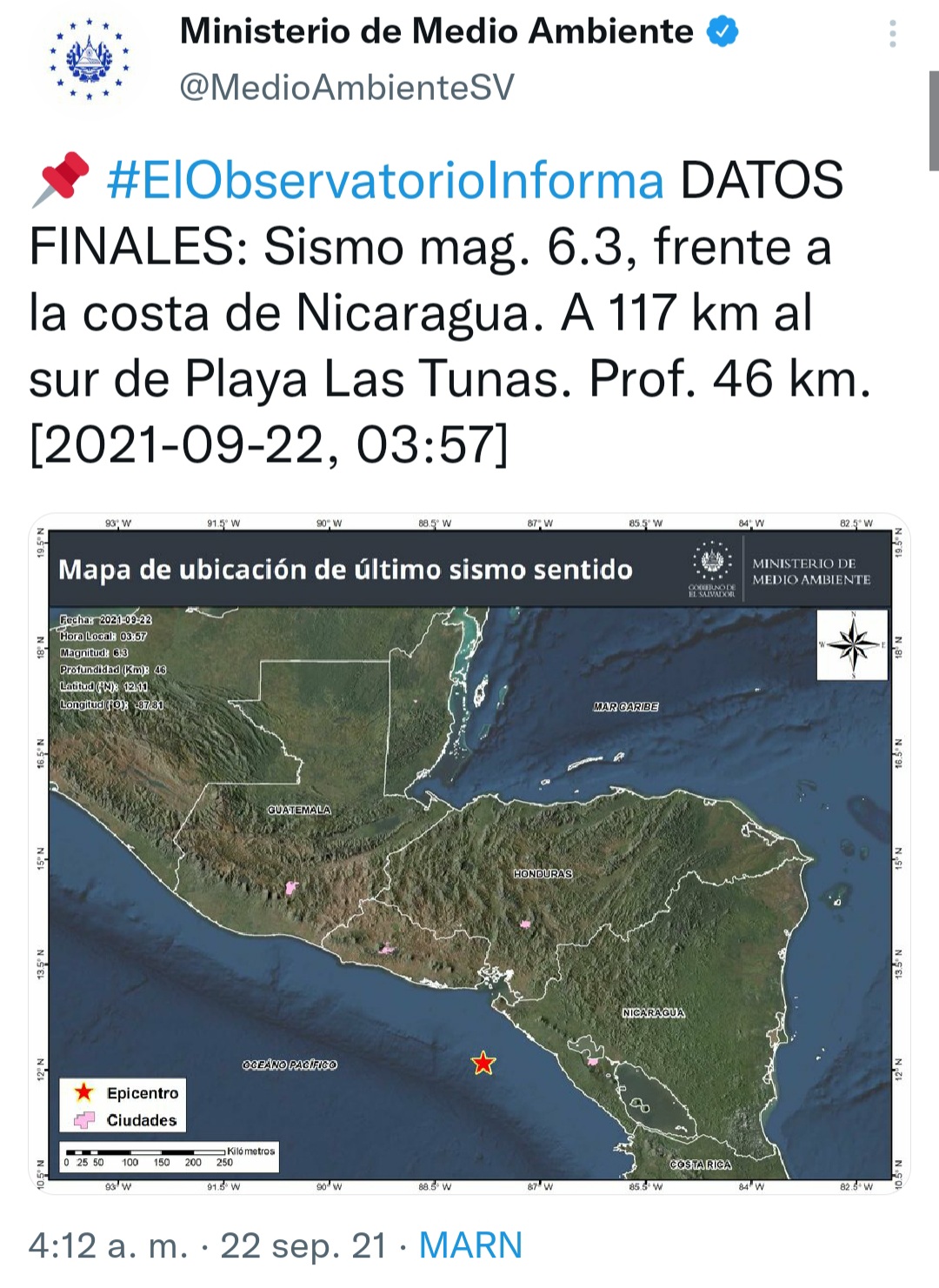 Medio Ambiente también registró un sismo de magnitud 4.7, frente a la costa de Nicaragua, a las 4:42 am. El sismo tuvo como epicentro 124 km al sur de Playa Las Tunas, con una profundidad de 10 km.