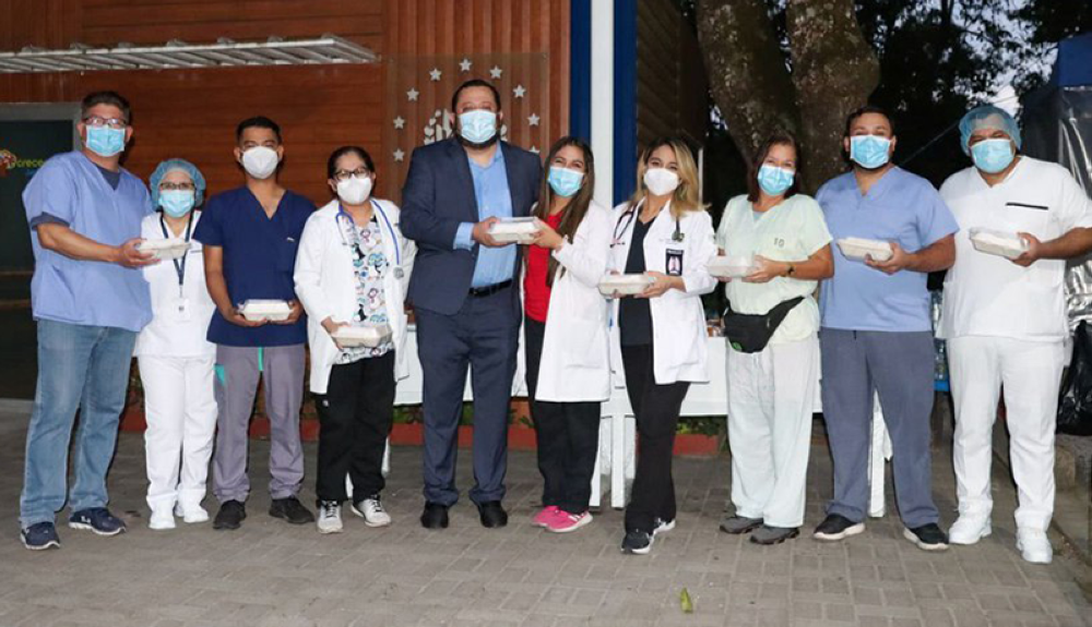 El Gobierno informó que brindaron alimentos al personal de salud del Hospital Nacional San Rafael, Hospital Médico Quirúrgico, Hospital Policlínico Zacamil, 1 de Mayo, Hospital de San Miguel, Hospital Nacional de Niños Benjamín Bloom, Hospital San Bartolo, Hospital de La Mujer y el Hospital Saldaña.