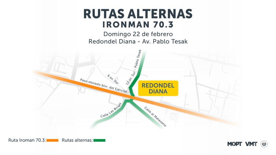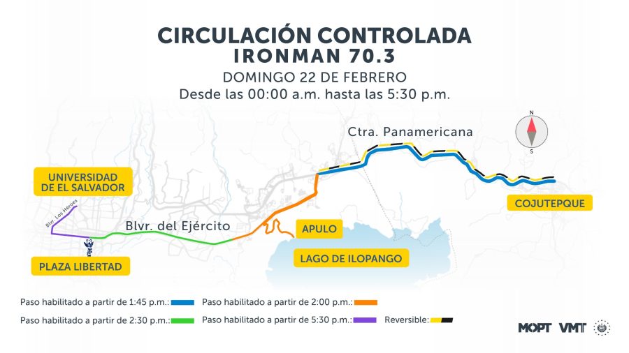 La circulación vehicular entre los distritos de Ilopango, Cojutepeque y San Salvador tendrá restricciones este domingo, 22 de febrero, debido al desarrollo del triatlón “Ironman 70.3”, que se desarrollará por primera vez en el país, informó el viceministro de Transporte, Nelson Reyes. Los cierres comenzarán a las 0:00 horas y se irán habilitando progresivamente a partir de la 1:45 de la tarde.
