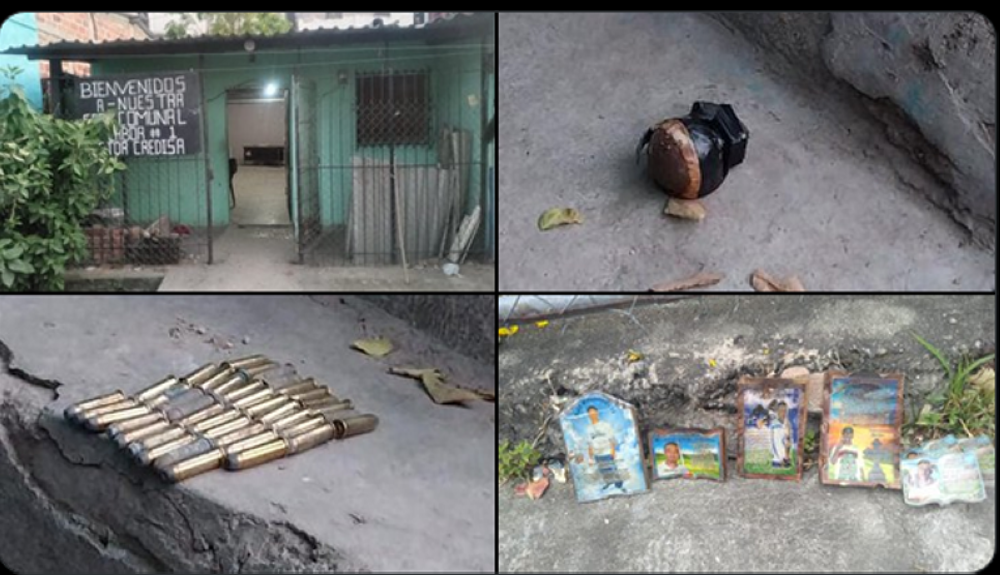 “En la casa comunal de la Comunidad La Labor 1, Soyapango; nuestros policías encontraron entre los muros de contención y el patio: Una granada de mano, 39 cartuchos para arma, 7 recuerdos de terroristas muertos de la MS-13 y una camisa policial”.