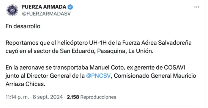 Un helicóptero UH-1H de la Fuerza Armada se estrelló la noche de este domingo en el cantón San Eduardo, en Pasaquina, La Unión, informó la institución castrense en la red social X, a las 11:14 de la noche.