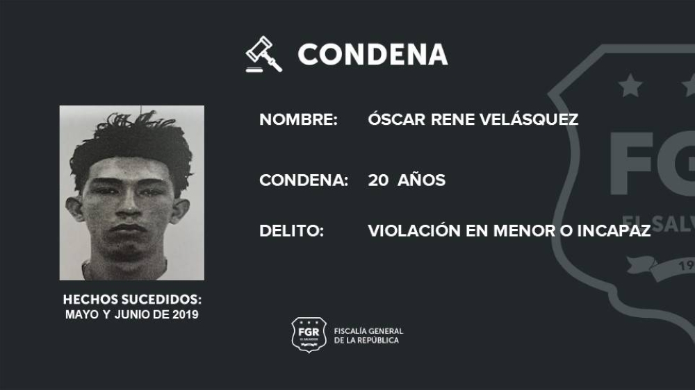 Óscar Velásquez fue condenado a 20 años de cárcel por violar a una niña en el cantón Las Delicias, San Miguel, el sujeto también es señalado de pertenecer a pandillas, de acuerdo con información difundida por la Fiscalía General de la República.