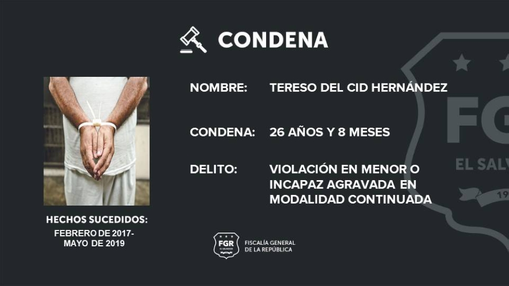 La Fiscalía General de la República (FGR) notificó que Tereso del Cid Hernández, de nacionalidad hondureña, fue condenado a 26 años y 8 meses de cárcel por comprobarse que violó a una niña de seis años entre febrero de 2017 y mayo de 2019.