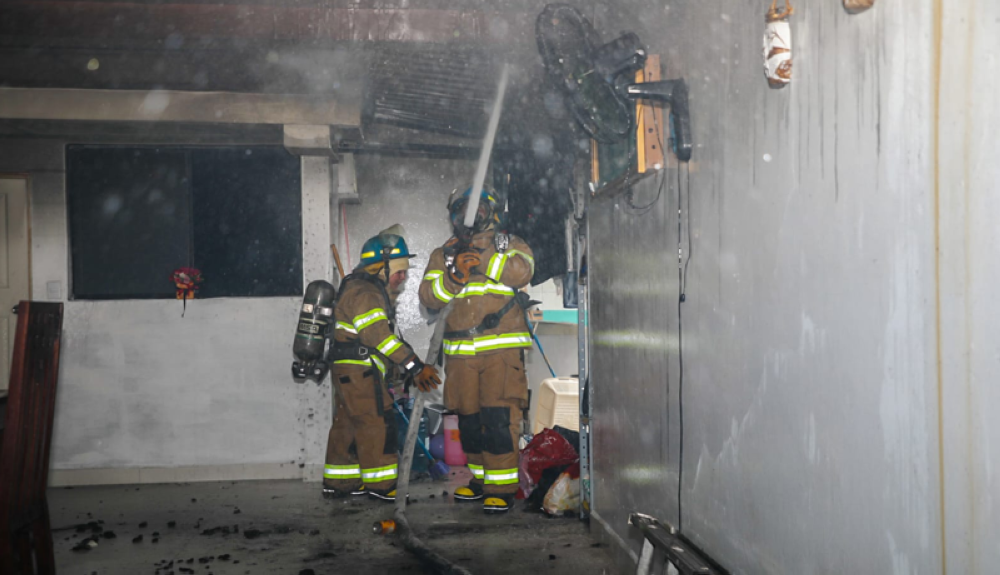 Nuestro #EquipoTácticoOperativo junto con el Cuerpo de @BomberosSV, realizan labores de extinción de incendio estructural.