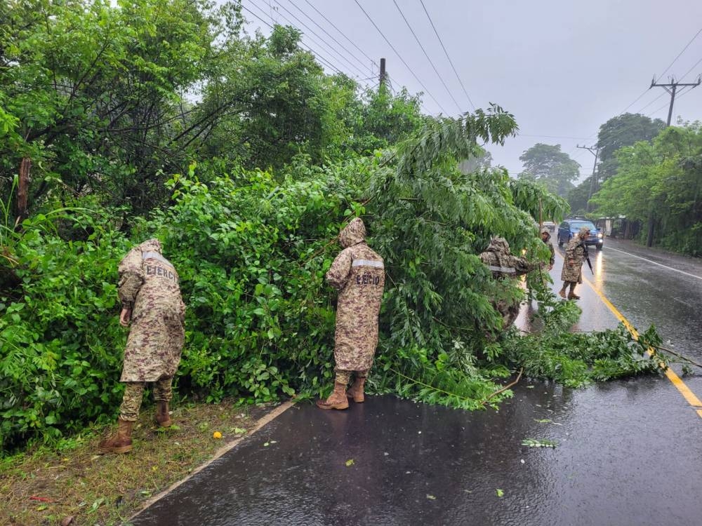 Bomberos y Protección Civil retiraron otro árbol en el kilómetro 12 de la ruta militar en el cantón Trinidad. Los pobladores del sector de La Sabana en Sonsonate Este también han reportado en redes un deslizamiento de tierra debido a la vulnerabilidad en el suelo.