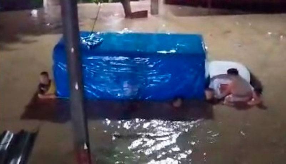 Utilizando un lazo, los habitantes de la zona lograron rescatar a las personas atrapadas, con el riesgo del agua que les llegaba casi al cuello.#ClimaSV | Camión atrapado por inundación en la colonia Montelimar de Olocuilta.