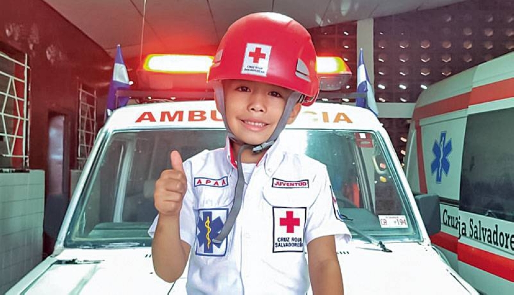 Una camisa blanca, un pantalón azul y un casco rojo con la insignia de la Cruz Roja Salvadoreña es el vestuario que porta los fines de semana Jason Alejandro Gómez, un pequeño de seis años de edad, quien junto a sus padres forma parte del equipo de voluntarios del cuerpo de socorro en el municipio de Sensuntepeque, departamento de Cabañas.