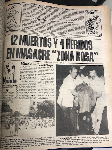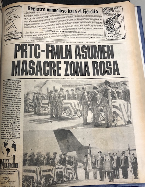 El 19 de junio de 1985 -hace 34 años- una tranquila noche de miércoles terminó en una matanza brutal en una acera de la Zona Rosa de San Salvador. Guerrilleros del Comando Urbano Mardoqueo Cruz del Partido Revolucionario de los Trabajadores Centroamericanos (PRTC), una de las organizaciones del FMLN, perpetraron una masacre que dejó 12 muertos y varios heridos. Entre las víctimas había cuatro infantes de marina estadounidenses desarmados, que departían como clientes en uno de los restaurantes.
