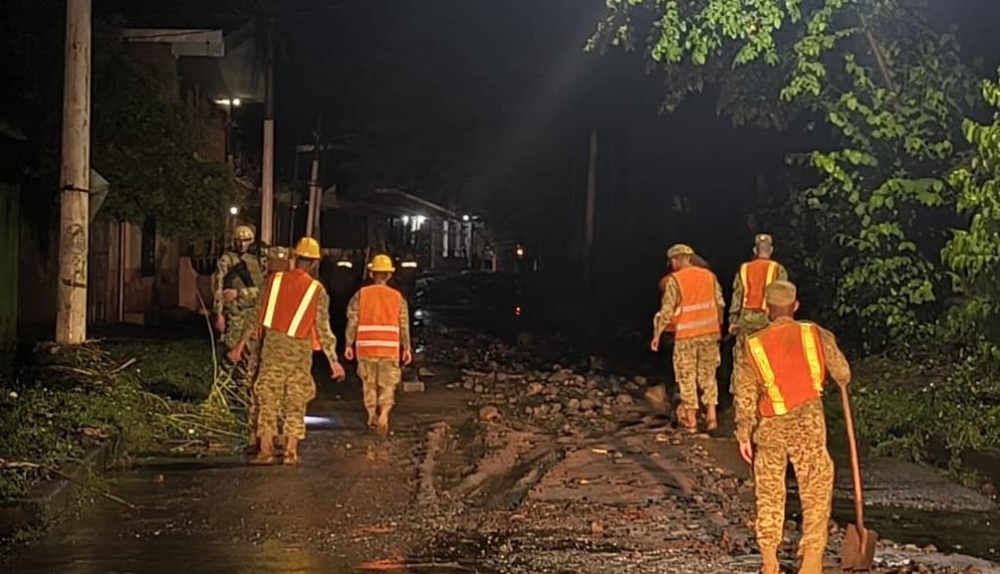 En esa misma jurisdicción, pero en la calle al cantón Sisimitepec, 11 soldados de la Fuerza Armada trabajaron en la remoción de un árbol caído que imposibilitó el paso.