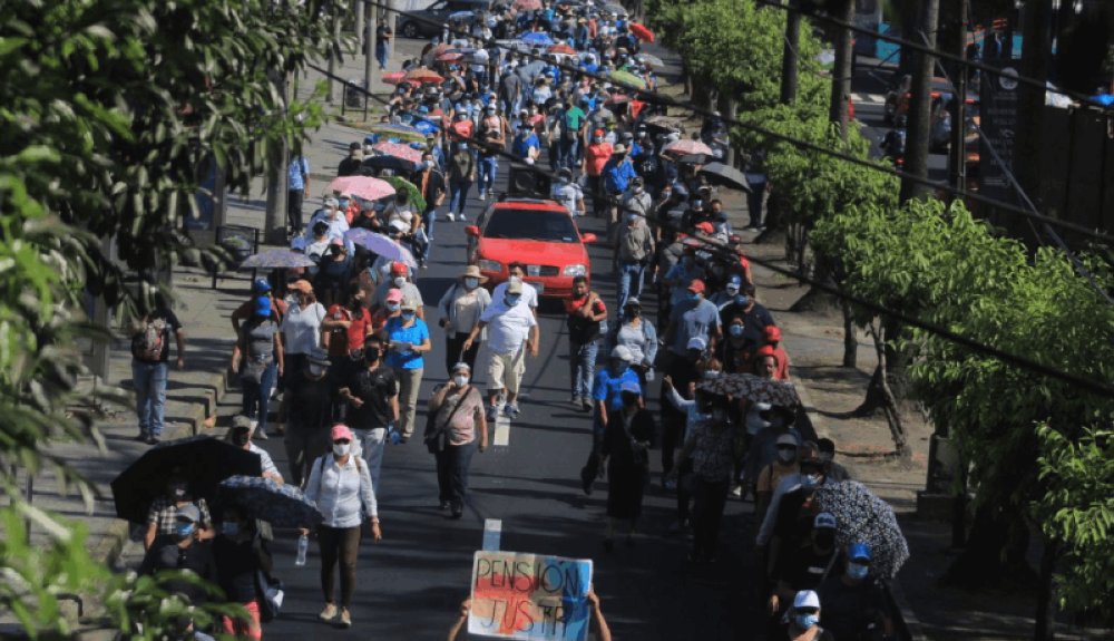 Sindicatos de maestros, policías y diferentes trabajadores del sector público y privado, marcharon este viernes hasta Casa Presidencial para exigirle al presidente de la República, Nayib Bukele, una reforma de pensiones, y la destitución de la ministra de Educación, Carla Hananía de Varela.